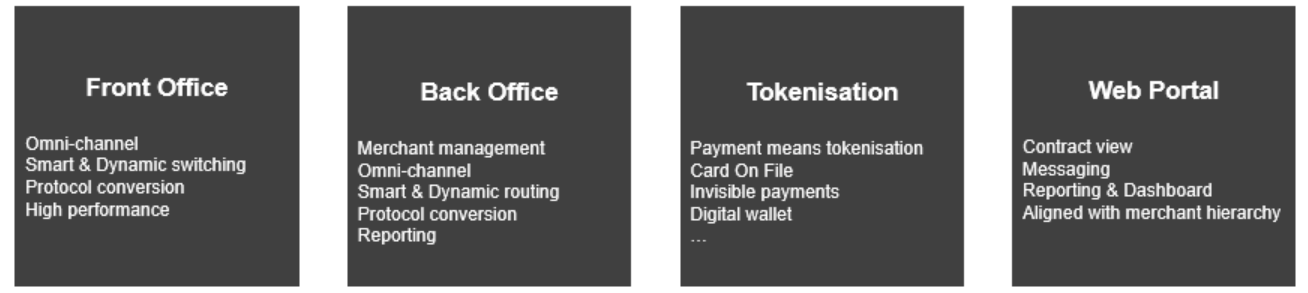 - Real-time protocol conversion to support the multiple configurations retailers are facing when deploying their platform in their own environment: acceptance platforms, acquirers, countries,….