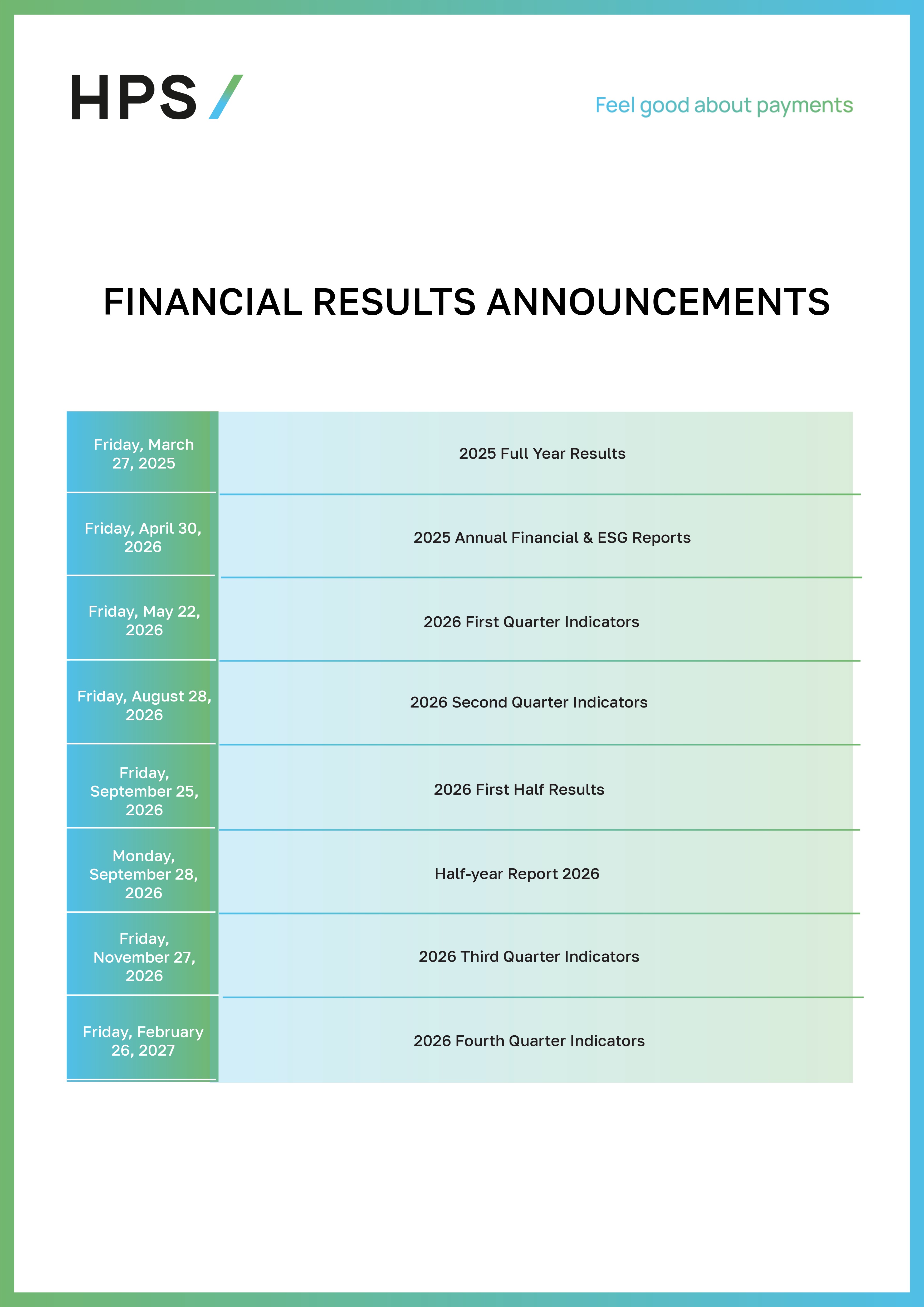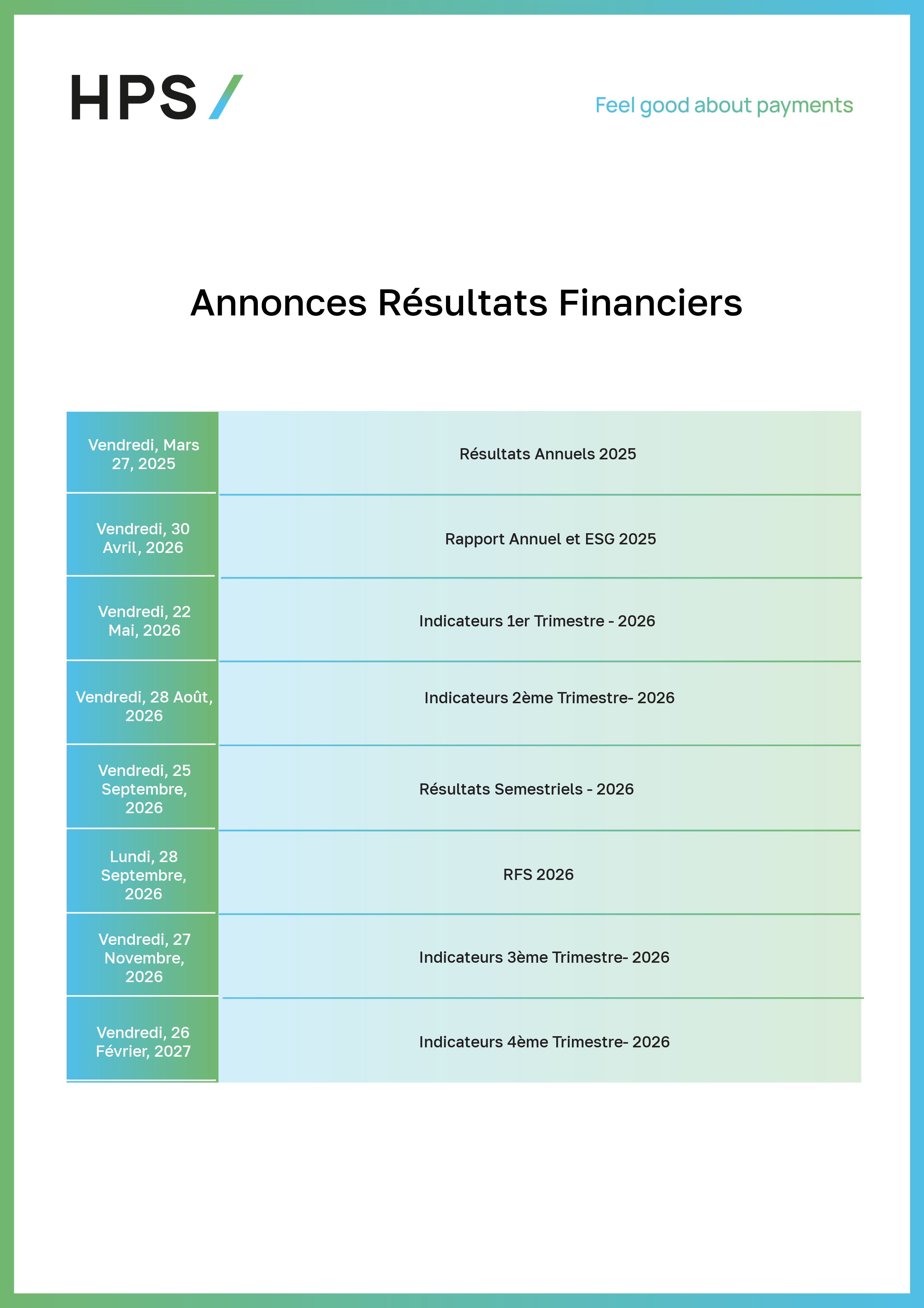Ces dates sont données à titre indicatif et peuvent subir des modifications. Elles ne sont en aucun cas engageantes. Les délais réglementaires de ces publications restent les seuls éléments engageants pour le management de HPS.